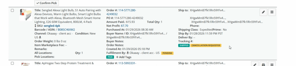 When an Amazon buyer submits a cancellation request, a clear “Cancellation Requested” flag now appears inside your Orders view. These orders are automatically held from fulfillment.