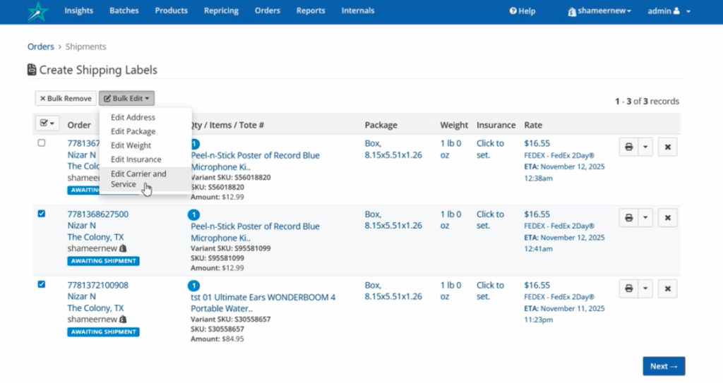 Managing shipping services one order at a time can slow down fulfillment during busy periods.